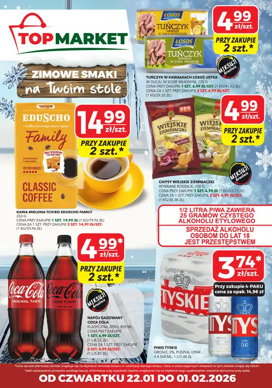Obejrzyj najnowszą gazetkę sieci Top Market, Gazetka, obowiązującą od 22 stycznia do 1 lutego. Ta aktualna gazetka Top Market zawiera wiele wspaniałych promocji na różnego rodzaju produkty.