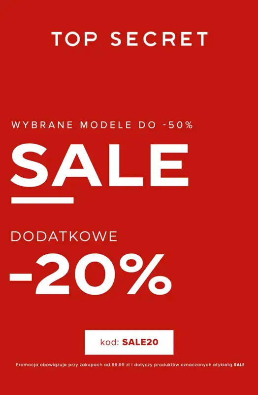 Obejrzyj najnowszą gazetkę sieci Top Secret, Extra -20% na wyprzedaż za min. 99,99 zł, obowiązującą od 3 lutego do 12 lutego. Ta aktualna gazetka Top Secret zawiera wiele wspaniałych promocji na różnego rodzaju produkty.